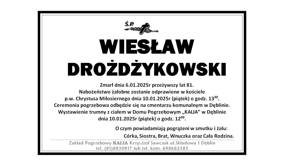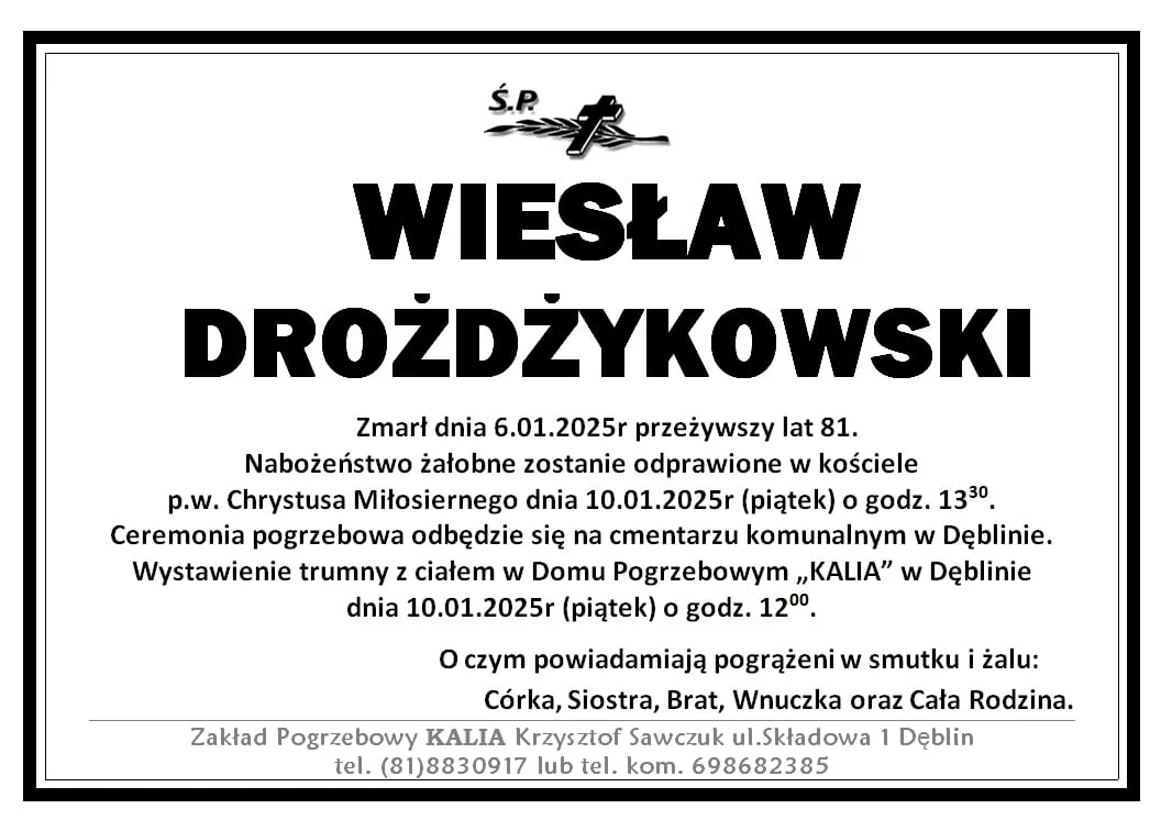 ZMARLI6 stycznia zmarł Wiesław Drożdżykowski. Miał 81 lat.