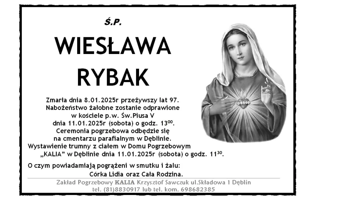 ZMARLI8 stycznia zmarła Wiesława Rybak. Przeżyła 97 lat.