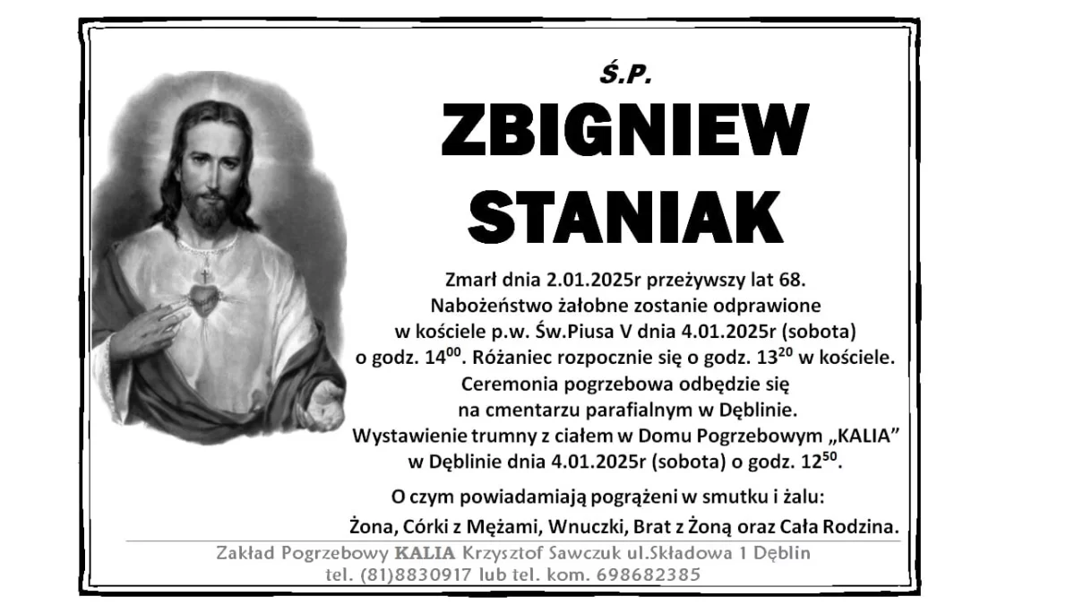 Nabożeństwo żałobne zostanie odprawione w kościele p.w. Piusa V w Dęblinie. Odbędzie się 4 stycznia (sobota) o godz. 14:00. Różaniec rozpocznie się o godz. 13:20 w kościele.