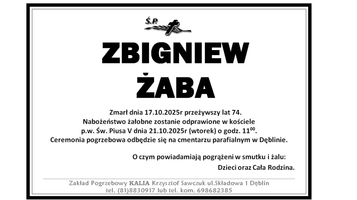 ZMARLI17 października zmarł Zbigniew Żaba. Miał 74 lata.