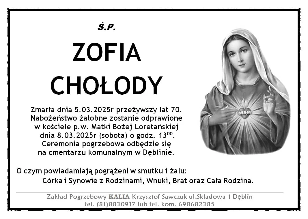 ZMARLI5 marca zmarła Zofia Chołody. Przeżyła 70 lat.